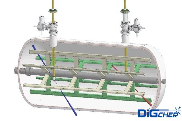 德高潔PVDF臥式反應釜自動化清洗系統,根據PVDF生產過程中,二氟乙烯(VDF)單體在臥式反應釜聚合反應的工作特點,結合臥式反應釜自身結構,設計研發的一套專用于臥式反應釜清洗的裝置。由高壓水清洗裝置搭載自動化清洗系統方式,實現操作簡單,自動化程度高,安全環保、節約時間,代替人工作業?梢苿邮皆O備,體積小,靈活性強,多點定位機構深度清洗,高壓水射流技術,三維旋轉噴頭與伸縮桿的復合運動,可以對反應釜內攪拌軸背面、底部、上封頭等位置的清洗,在不對反應釜造成物理損傷的情況下,實現360°無死角清洗。解決現有清洗方法中存在的自動化程度低、耗時費力、容易造成人身傷害等問題。